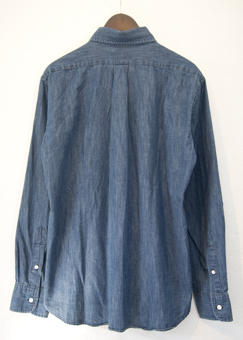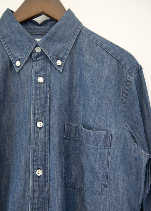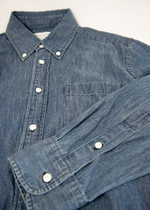 6ozデニムを使用したBDシャツです。製品でブリーチをかけ、デニム特有のアタリを出しています。ライトオンスのデニム生地にウォッシュド加工が施されているので、肌触りのよい着馴れた洗いざらしの雰囲気に仕上がっています。