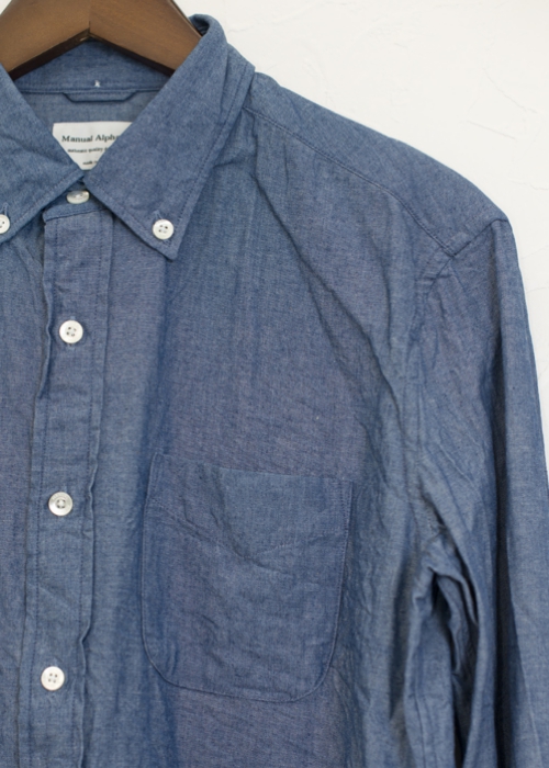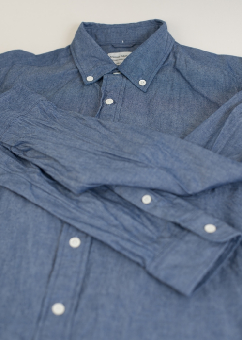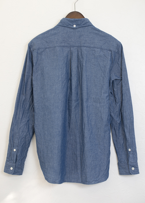 定番のインディゴシャンブレーを使用したボタンダウンシャツです。ワークシャツで多くみられるシャンブレー素材ですが、こちらはベーシックなボタンダウンタイプで、よりデイリーにオールシーズンご使用いただけます。釦にはオリジナルの貝釦を使用しています。