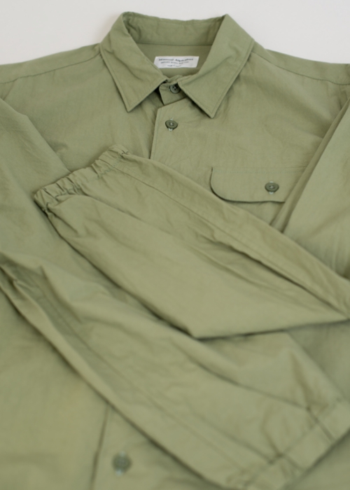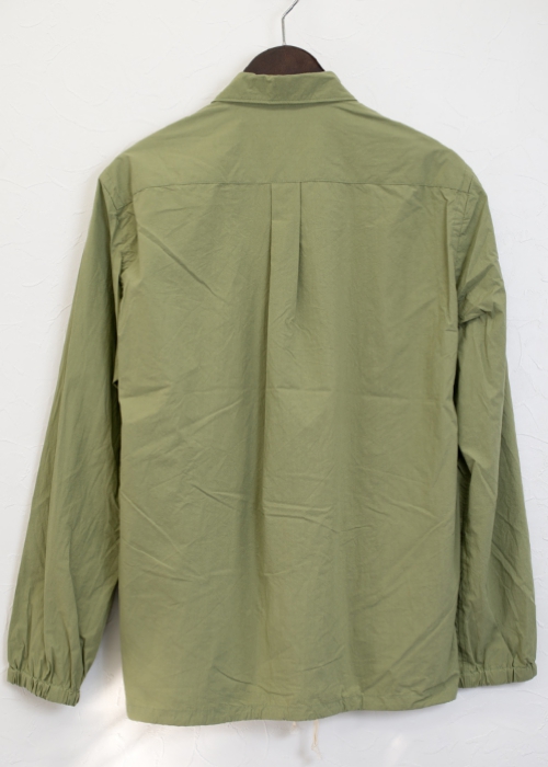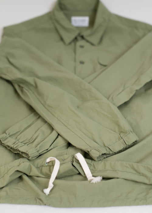 特殊樹脂でワッシャー仕上げされた80/1タイプライター生地を使用した、コーチジャケット風のシャツです。コーチジャケットのディテールをシャツに落とし込んだ新しいスタイルの一枚です。シャツとしてはもちろん、羽織として、また裾のドローコードでシルエットをアレンジしたりと、色々な着こなしが楽しめます。
