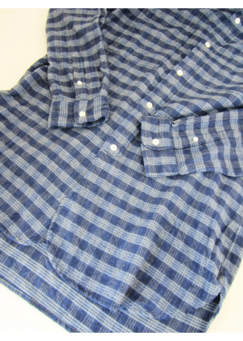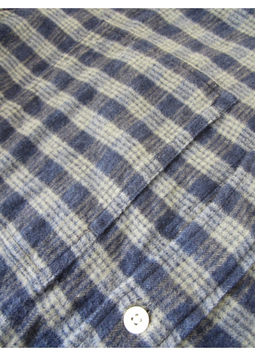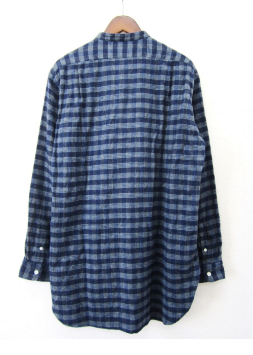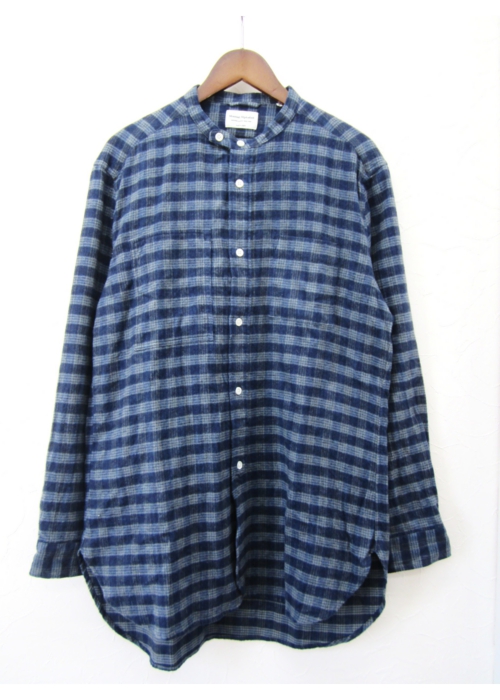衿はバンドカラーにチンガードの付く少しワークテイストをプラスしたデザインです。また胸ポケットもワークシャツのディテールをプラスしアクセントにしています。