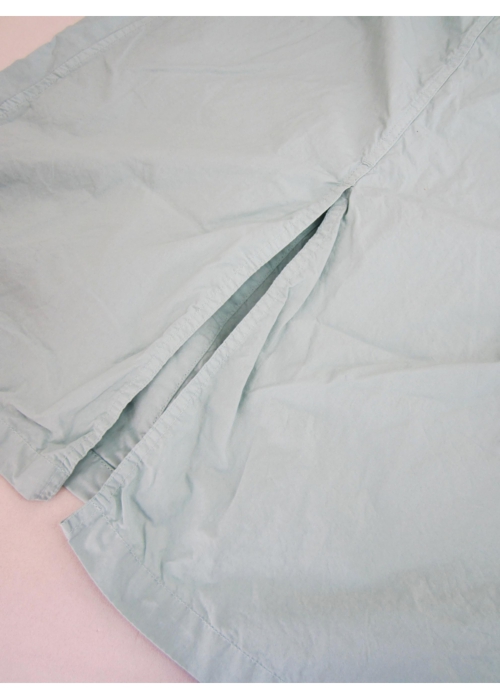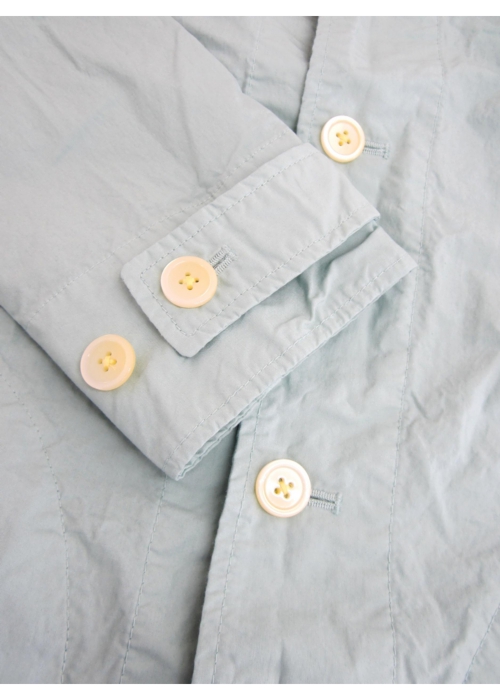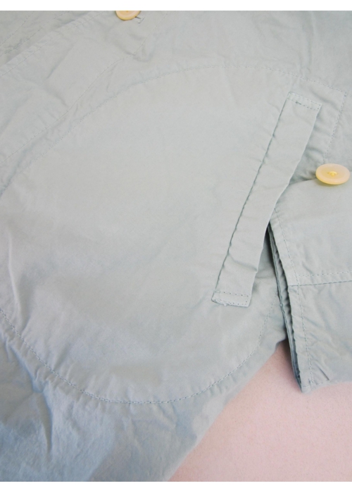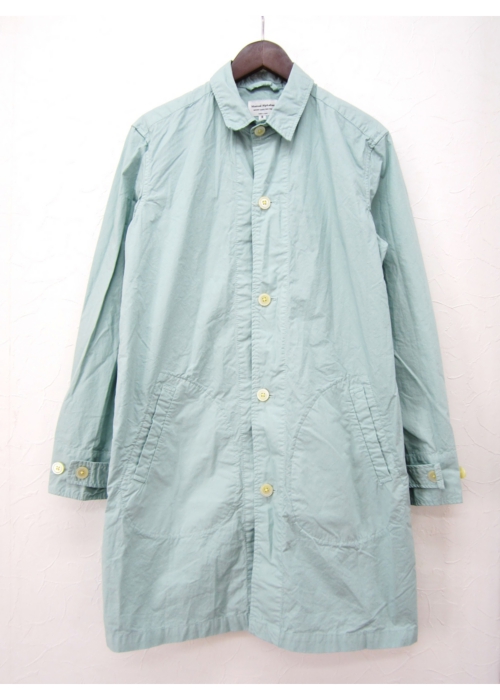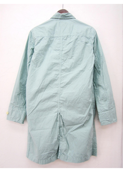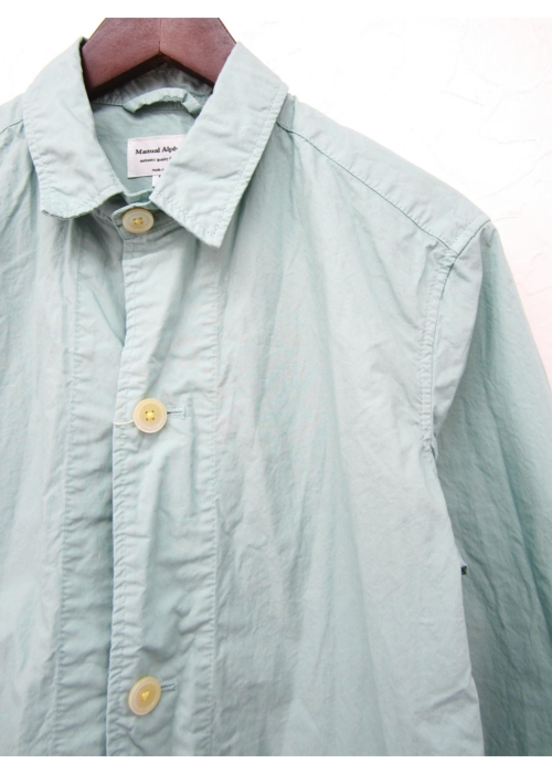 MANUAL ALPHABET定番の40タイプライタークロスのコート。タイプライタークロスとは長繊維で細い高級綿糸を用いた平織物です。目が詰まっており、薄い生地ですが、丈夫でシャリ感があります。シャツ感覚で楽しんでもらえるよう、素材だけではなくパターンもシャツをベースに、台衿・ヨーク・脇の折り伏せなど、所々にシャツのディテールをプラスしています。洗いざらした雰囲気の生地には、シワ感やパッカリングも綺麗に立体的に出ています。