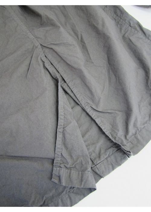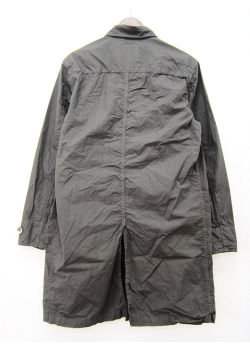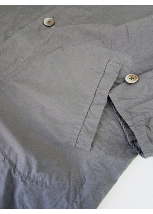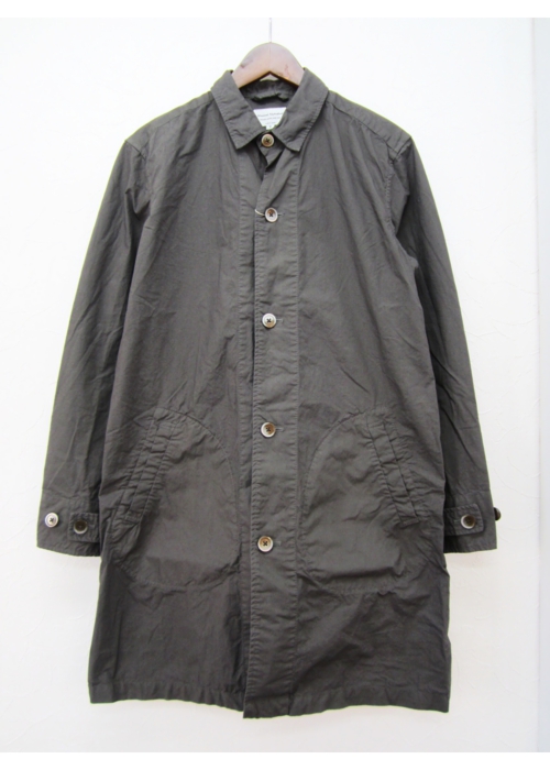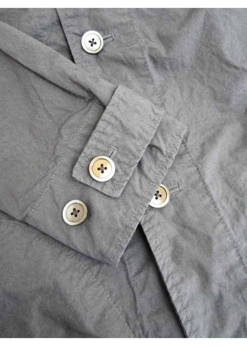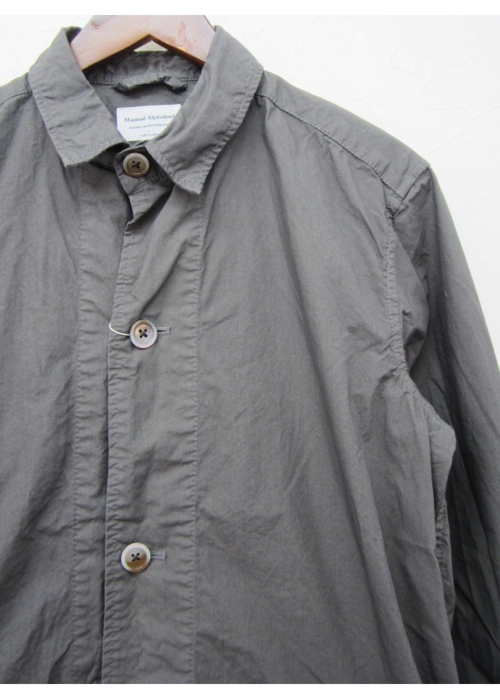 MANUAL ALPHABET定番の40タイプライタークロスのコート。タイプライタークロスとは長繊維で細い高級綿糸を用いた平織物です。目が詰まっており、薄い生地ですが、丈夫でシャリ感があります。シャツ感覚で楽しんでもらえるよう、素材だけではなくパターンもシャツをベースに、台衿・ヨーク・脇の折り伏せなど、所々にシャツのディテールをプラスしています。洗いざらした雰囲気の生地には、シワ感やパッカリングも綺麗に立体的に出ています。