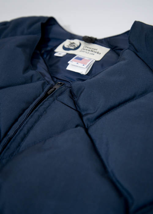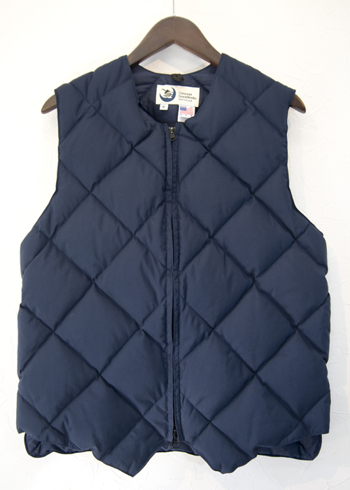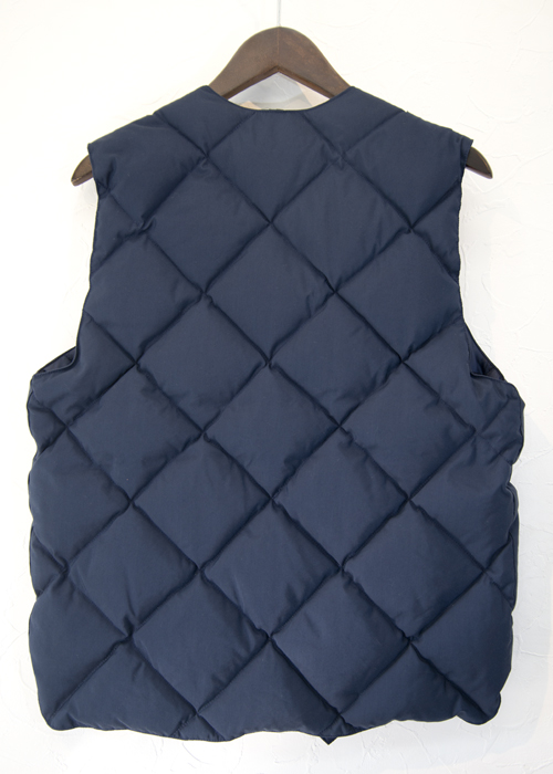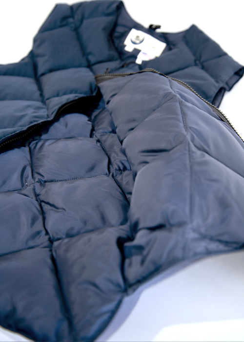 キルティング仕様で、ダウンの厚みを抑えたインナーベストです。表地には60/40クロス、裏地にはストリークフリーを採用しています。襟のないタイプですので、シャツ等とのコーディネイトに最適です。またフロントはダブルジップになっておりますので、コーディネイトに変化が付けられます。もちろんグースダウンを使用しておりますので、アウターとしても活躍します。