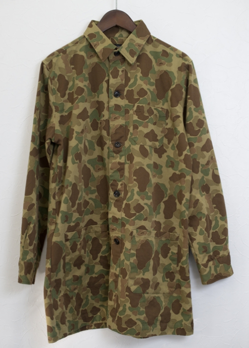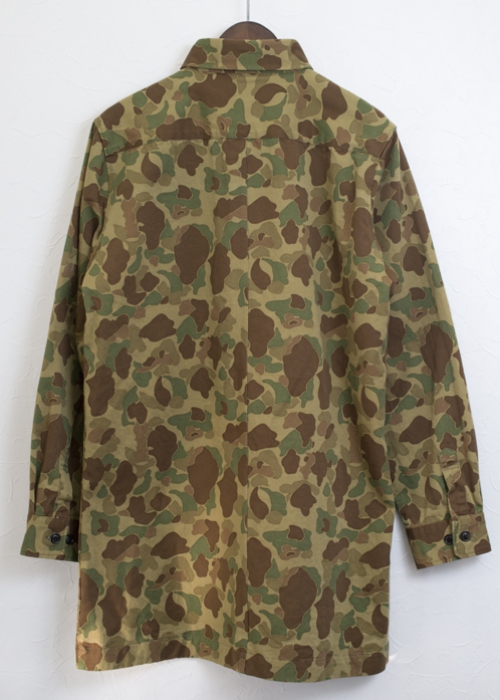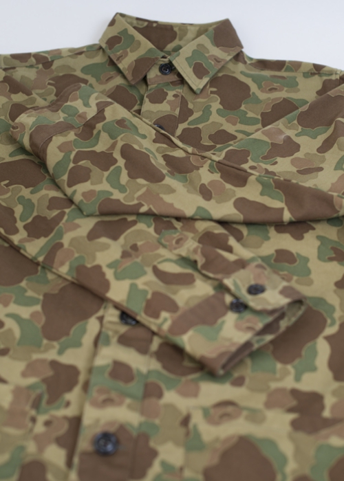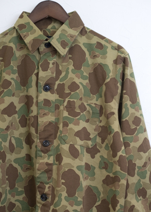 ハンターカモ柄プリントコットンツイル アトリエコートワークの様なシンプルなフォルムに、アクセントにもなる大きめの4つ穴ボタンを配しています。直球のデザインにミリタリー柄を組み合わせることで、個性と汎用性を両立した1枚。ワークらしくラフに着こなせるデザインとシャツ生地特有の軽い着心地が魅力のアトリエコートです。