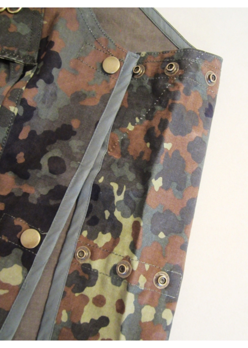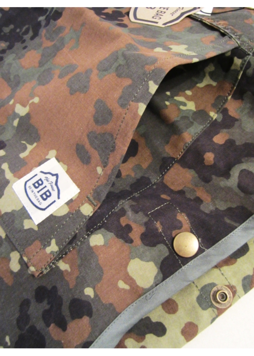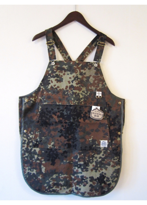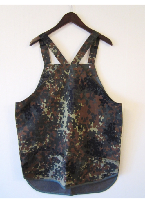 USEDのドイツ軍のテントをリメイクして作ったCRAFTMANベースの1点裁断のBIBです。腹部には上部フラップポケットとサイドのハンドウォーマーの二重構造の大型ポケットが配置されています。