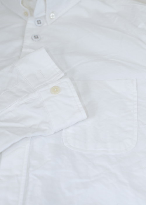 やや大きめの襟は独特の位置に配置された第一ボタンにより程良い開きを作ります。上2つのボタンは共地の包みボタンを使用し、以下は比翼仕様になっています。肩幅に対しゆったりめの身幅で着心地も良く、程良い着丈の長さでシルエットも綺麗です。通常のオックスフォード生地より柔らかめの生地感で、さらに洗いをかけたままのシワの残る仕上げが、nisicaらしい自然な雰囲気を作っています。この雰囲気もユニセックスで着られるnisicaの魅力の一つです。
