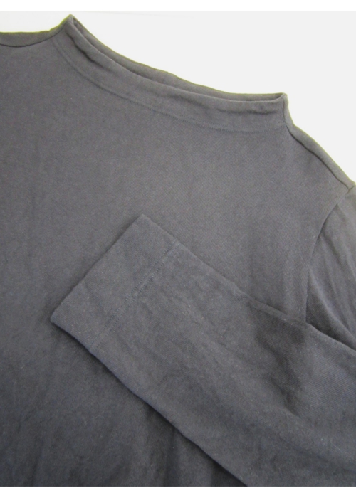 ガンジーニットのディテールをバスクシャツに落とし込んだ様な、程良い開き具合に少し立ち上がる襟元が特徴のカットソーです。体のラインが出にくいゆったりとしたシルエットで、一枚はもちろん、シャツの上からでもバランス良く着こなせます。洗いのかかった柔らかな風合いで、シーズンを通して着て頂けます。しっかりとした厚手のコットン生地を使用しているので、ガンガン洗濯もでき、着る程に体に馴染んでいきます。