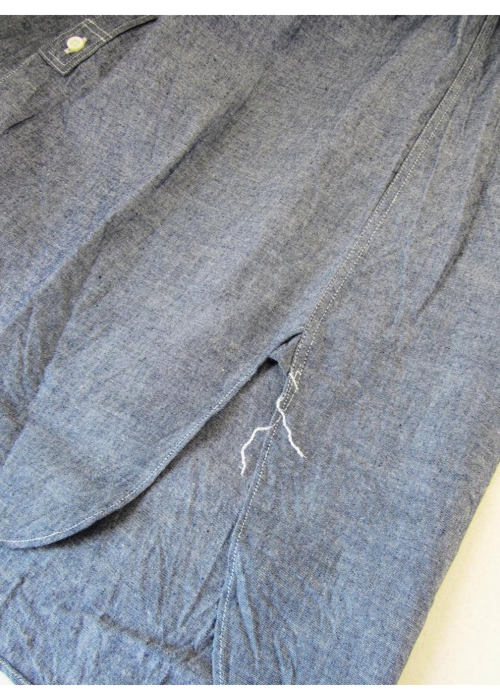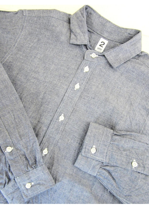 素材にはハリ感のあるインディゴシャンブレー地のブルーを使用し、着用とともに経年変化も楽しめます。