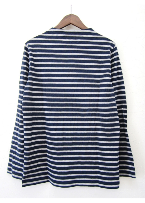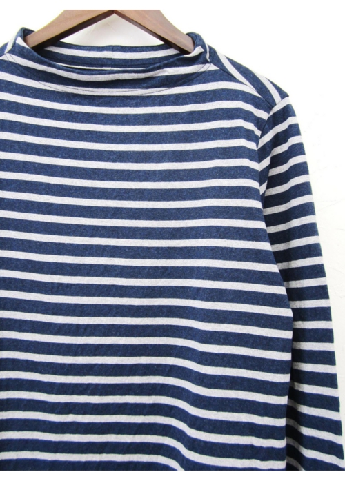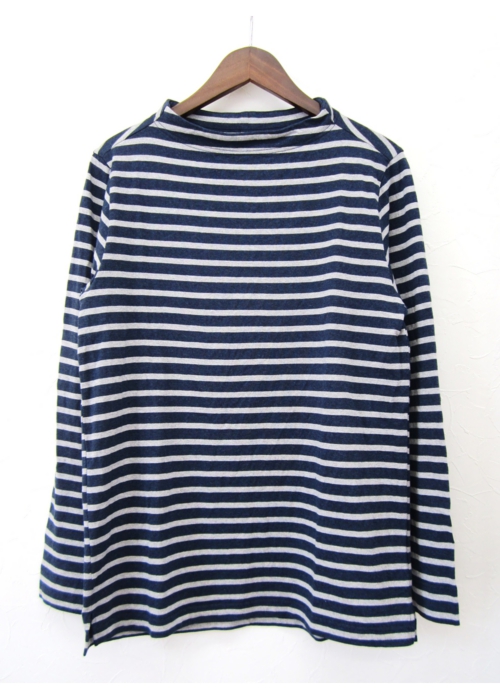 ガンジーニットのディテールをバスクシャツに落とし込んだ様な、程良い開き具合に少し立ち上がる襟元が特徴のカットソーです。