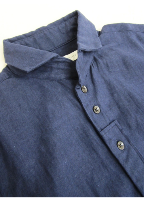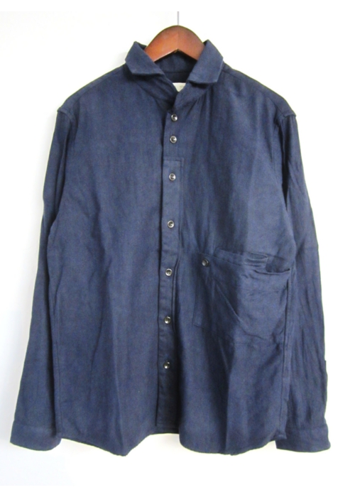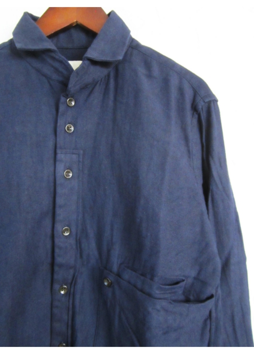襟の形や左胸の2重のポケットが特徴的なシャツです。