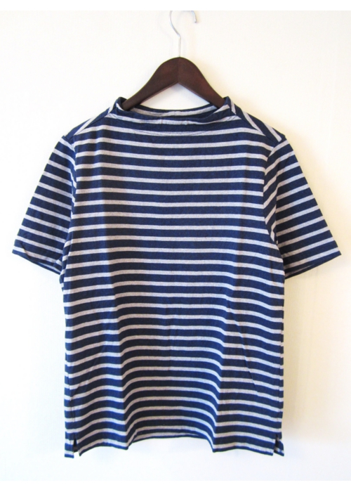 ガンジーニットのディテールをバスクシャツに落とし込んだ様な、程良い開き具合に少し立ち上がる襟元が特徴のカットソーです。
