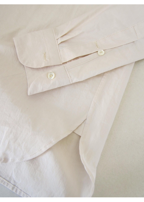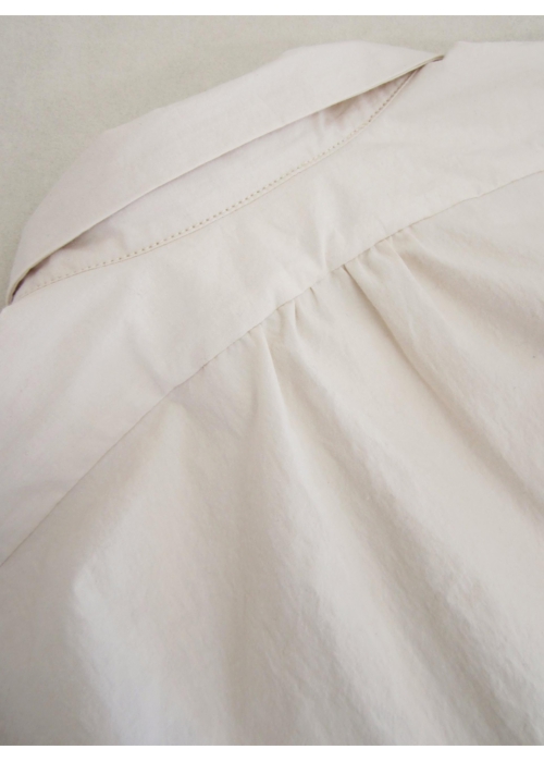 台襟が非常に低く、まっすぐで小さめの襟は、トップまでボタンを留めると襟が少し重なり、意図的に少しいびつな襟元を作ります。ネック周りも大きめに取られているので、トップまでボタンを留めても苦しくなりません。